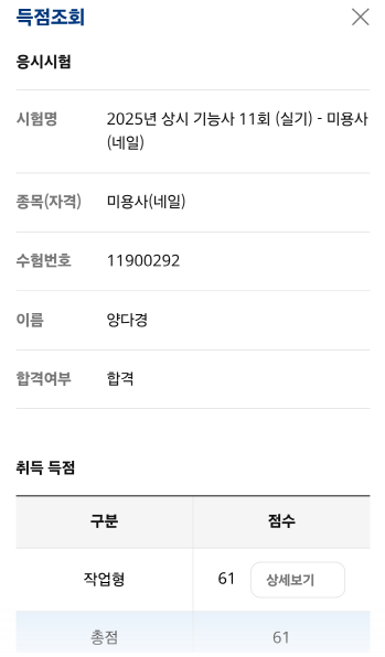 미용사(네일) 합격 페이지 정보 작성자 춘천캠퍼스 작성일25-07-03 10:13 조회112회 댓글0건 관련링크 이전글 다음글 목록 본문 . 댓글목록 등록된 댓글이 없습니다. 이전글 다음글 목록