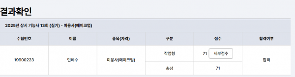 미용사(메이크업) 합격 페이지 정보 작성자 춘천캠퍼스 작성일25-07-31 10:57 조회351회 댓글0건 관련링크 이전글 다음글 목록 본문 . 댓글목록 등록된 댓글이 없습니다. 이전글 다음글 목록