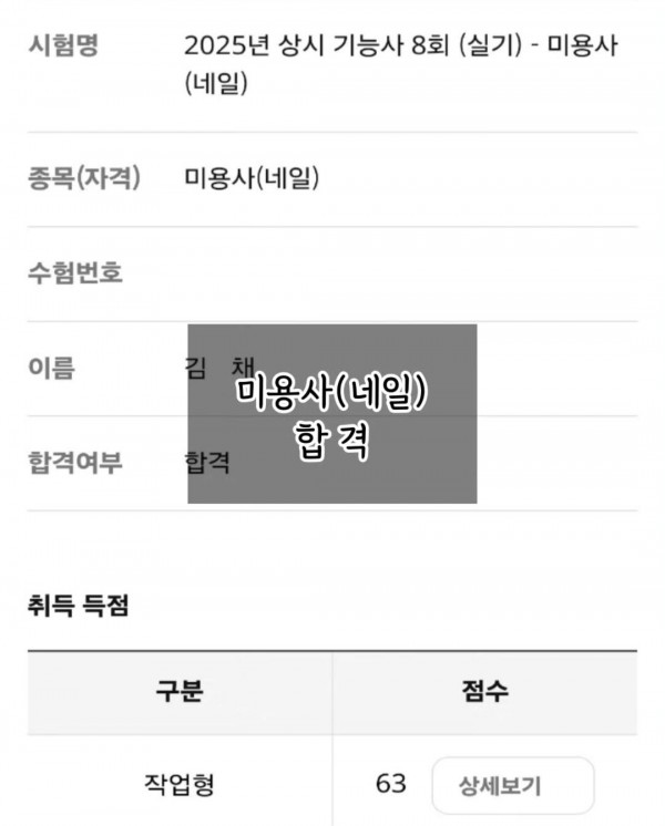 미용사(네일) 합격 페이지 정보 작성자 춘천캠퍼스 작성일25-05-08 16:28 조회223회 댓글0건 관련링크 이전글 다음글 목록 본문 . 댓글목록 등록된 댓글이 없습니다. 이전글 다음글 목록