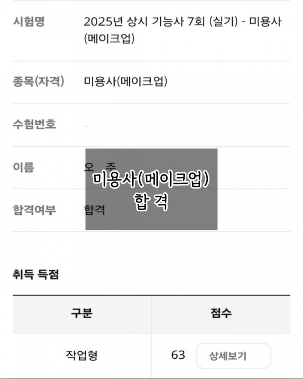 미용사(메이크업) 합격 페이지 정보 작성자 춘천캠퍼스 작성일25-05-08 16:29 조회234회 댓글0건 관련링크 이전글 다음글 목록 본문 . 댓글목록 등록된 댓글이 없습니다. 이전글 다음글 목록
