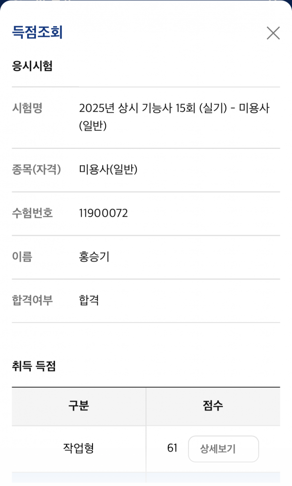 미용사(일반) 합격 페이지 정보 작성자 춘천캠퍼스 작성일25-08-28 13:56 조회288회 댓글0건 관련링크 이전글 다음글 목록 본문 . 댓글목록 등록된 댓글이 없습니다. 이전글 다음글 목록