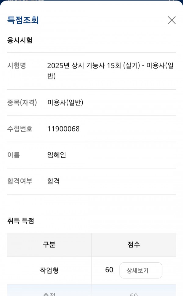 미용사(일반) 합격 페이지 정보 작성자 춘천캠퍼스 작성일25-08-28 13:57 조회291회 댓글0건 관련링크 이전글 다음글 목록 본문 . 댓글목록 등록된 댓글이 없습니다. 이전글 다음글 목록
