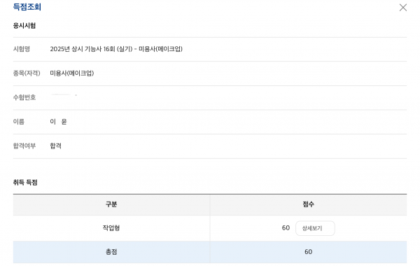 미용사(메이크업) 합격 페이지 정보 작성자 춘천캠퍼스 작성일25-09-18 13:16 조회283회 댓글0건 관련링크 이전글 다음글 목록 본문 . 댓글목록 등록된 댓글이 없습니다. 이전글 다음글 목록