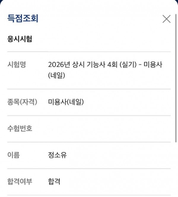 네일국가자격증 원패스 합격 페이지 정보 작성자 춘천캠퍼스 작성일26-03-30 15:52 조회1,183회 댓글0건 관련링크 이전글 다음글 목록 본문 원패스 합격 축하해주세용:) 댓글목록 등록된 댓글이 없습니다. 이전글 다음글 목록